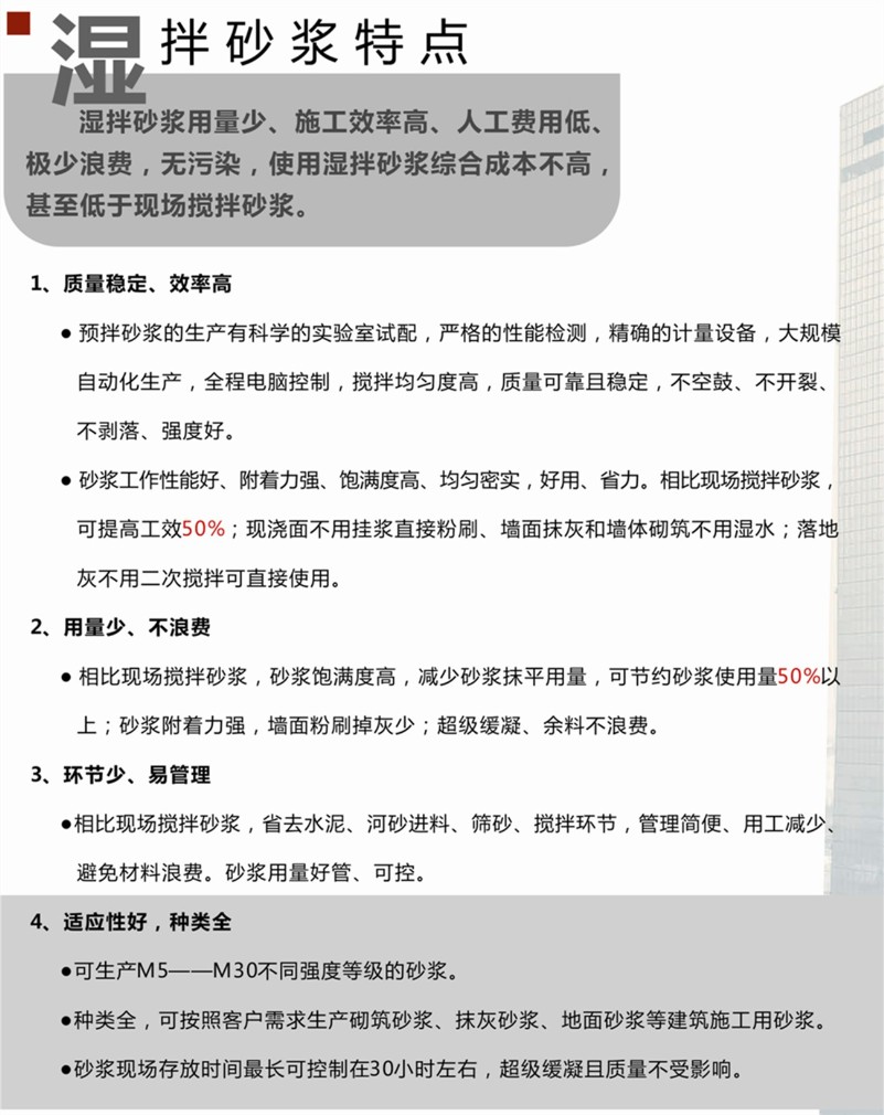 公司總投資5000多萬元,占地3萬平方米,擁有HZS-180德國進口攪拌機自動化混凝土生產線兩條,整個生產流程均為電腦化、自動化、標準化,配套“三一重工”、“中聯重科”先進的混凝土輸送設備8臺,運輸攪拌車30余臺,具有年產混凝土80萬方、濕拌砂漿30萬噸的供貨能力。通過綠色升級改造,建成封閉料庫5000多平方米、生產車間800多平方米,加裝噴淋、隔音、收塵、砂石分離機等設施,達到了國家預拌混凝土綠色生產JGJ/T328-2014星級管理標準。